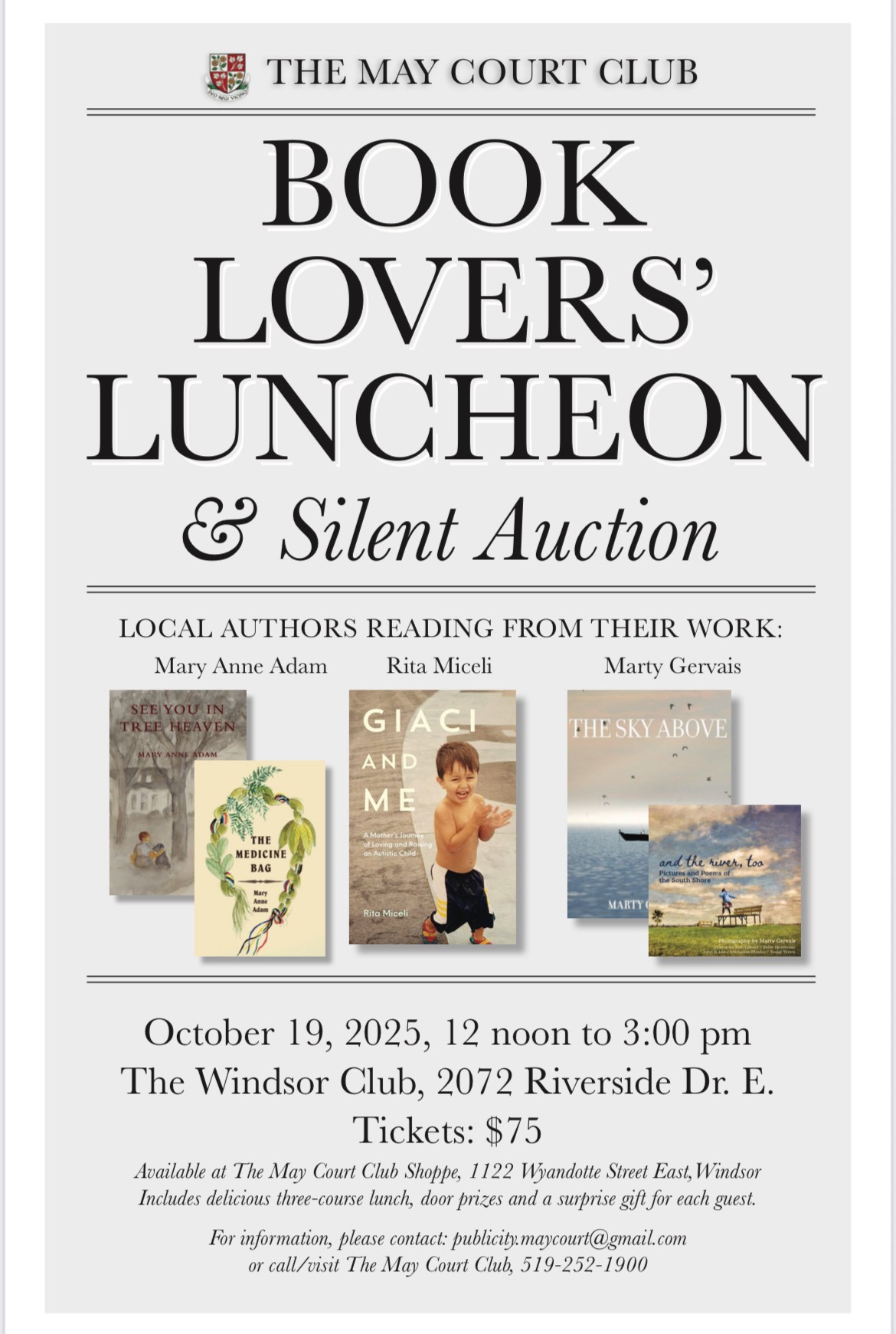 The May Court Club invites you to an inspiring afternoon celebrating local literature and community connection. Enjoy captivating readings from celebrated local authors Mary Anne Adam, Rita Miceli, and Marty Gervais, each sharing selections from their latest works. Guests will be treated to a delicious three-course lunch, along with door prizes and a special surprise gift for every guest. The afternoon also features a silent auction in support of The May Court Club’s charitable initiatives.