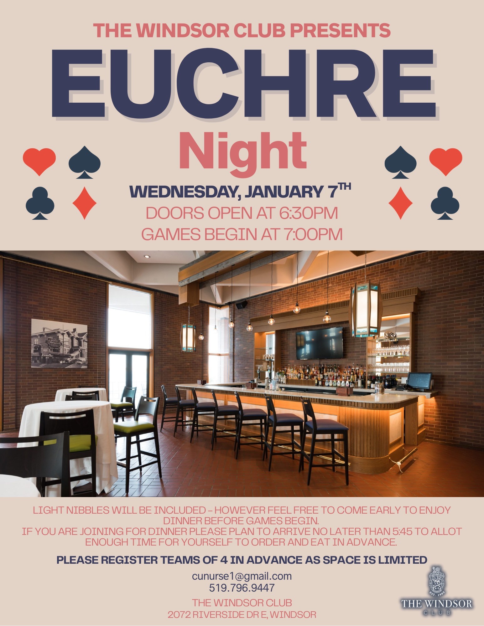 Get ready for an evening of cards, connection, and a little friendly competition at our upcoming Euchre Night! Whether you’re a longtime player or new to the game, this is the perfect chance to relax, meet fellow members, and enjoy a fun night at the Club. Come with a partner or on your own - pairings can be arranged.