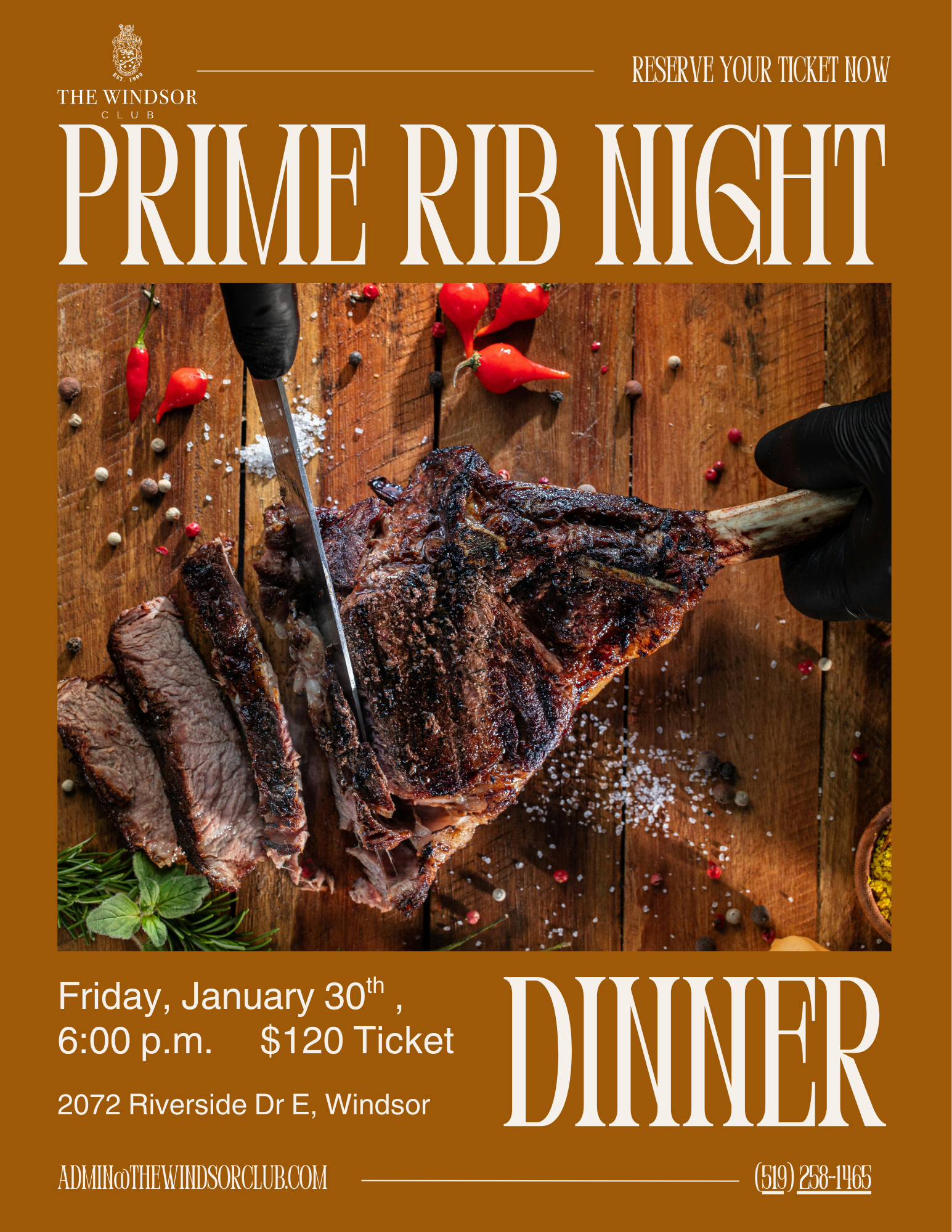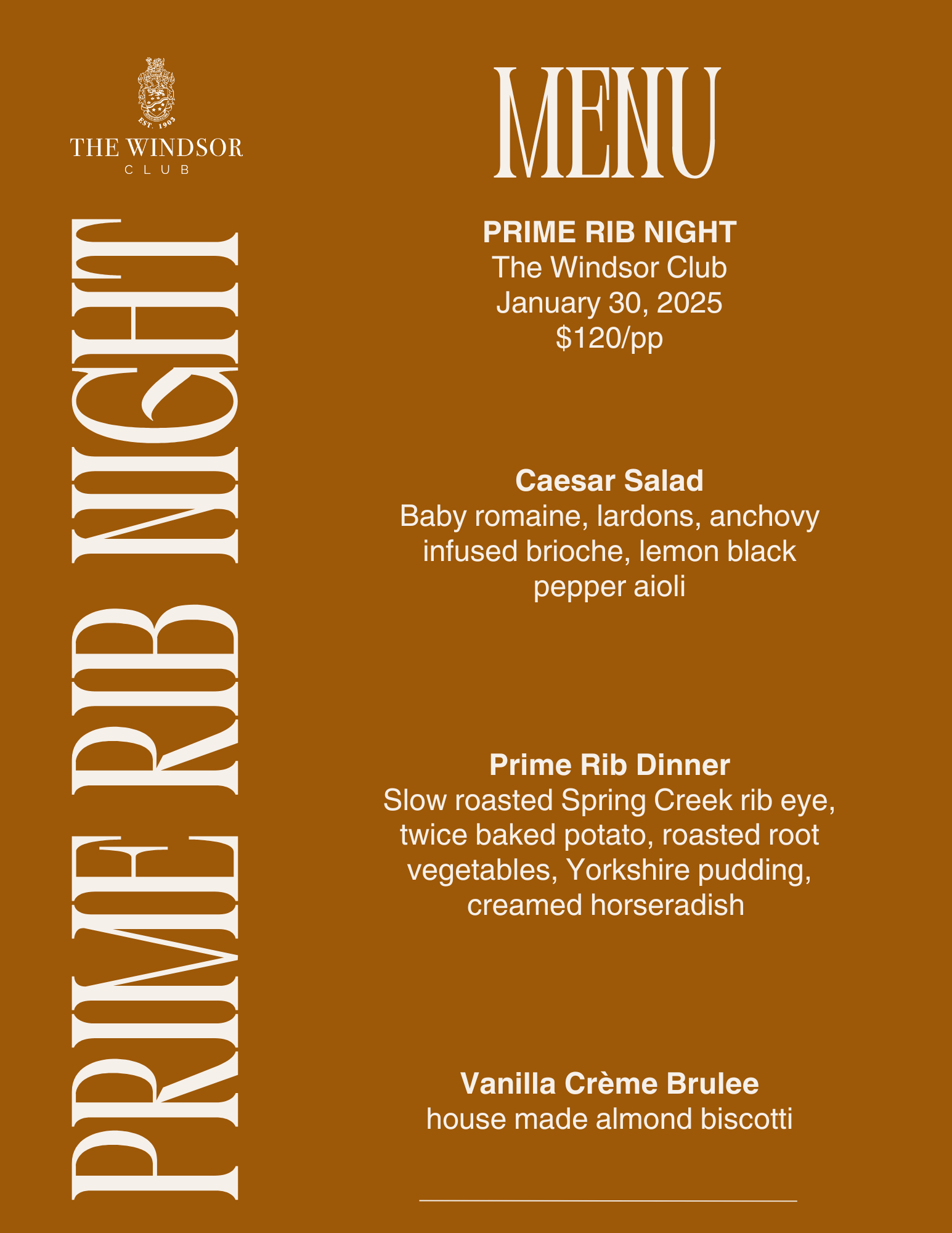 Prime Rib Night at The Windsor Club is a celebration of classic dining at its finest. Begin with a crisp Caesar Salad featuring baby romaine, lardons, anchovy-infused brioche, and lemon black pepper aioli.