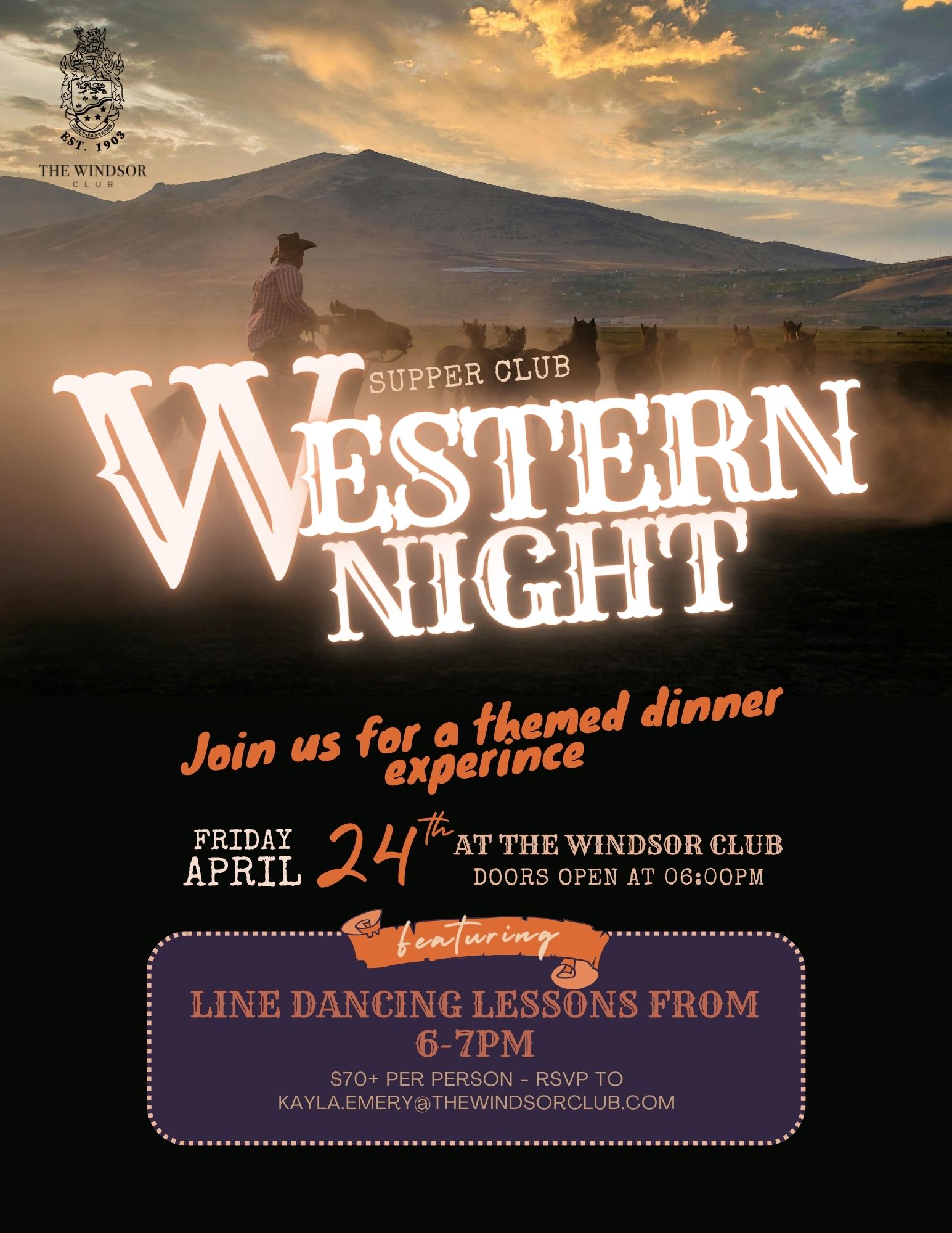 Saddle up for a lively evening at the Club with our Western-themed dinner experience. The night kicks off with an interactive line dancing lesson from 6:00pm to 7:00pm - perfect for beginners and seasoned dancers alike - setting the tone for a fun and spirited evening.